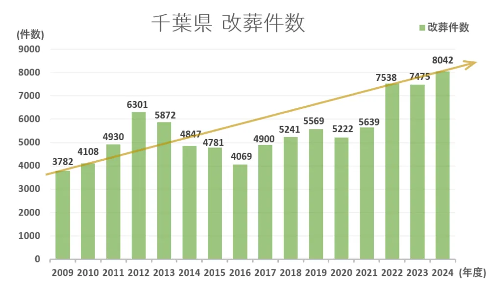 やはり千葉県も右肩上がりで改葬件数が上昇傾向で、最新の2023年度も過去最高件数であった昨年度と近い件数かございました。